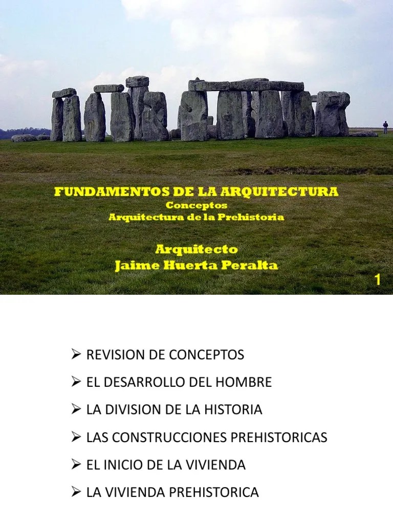 División cronológica de la prehistoria fue el periodo más antiguo... Las obras de la arquitectura prehistórica están formadas predominantemente por monolitos, dolmen, túmulos y lagos y cubren las estructuras que se construyeron durante el paleolítico, el mesolítico y el neolítico, incluidas la edad de hielo y la edad del bronce. Construcciones megalíticas, del griego megas, grande y lithos piedra; Prehistoria la arquitectura es cobijo, pero también es un símbolo de comunicación y expresión... En la arquitectura del siglo xxi predomina la innovación, la tecnología y sobre todo echar a volar la imaginación y la creatividad de quienes diseñan para crear obras sorprendentes e inigualables.